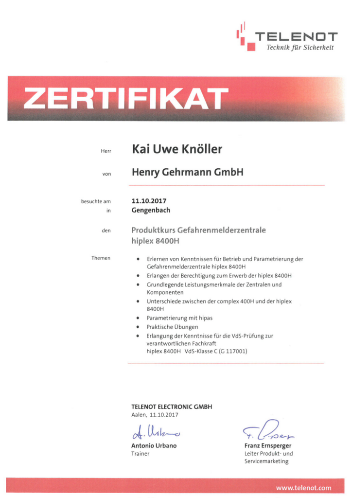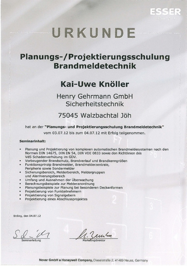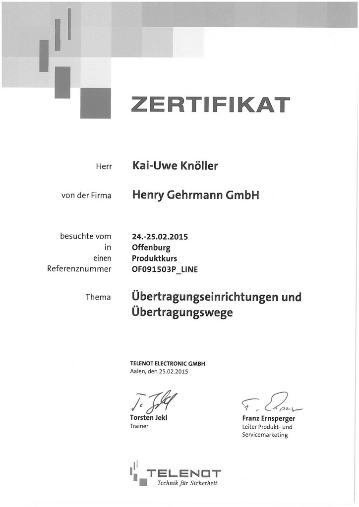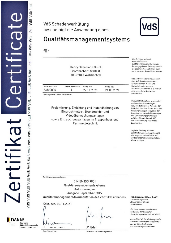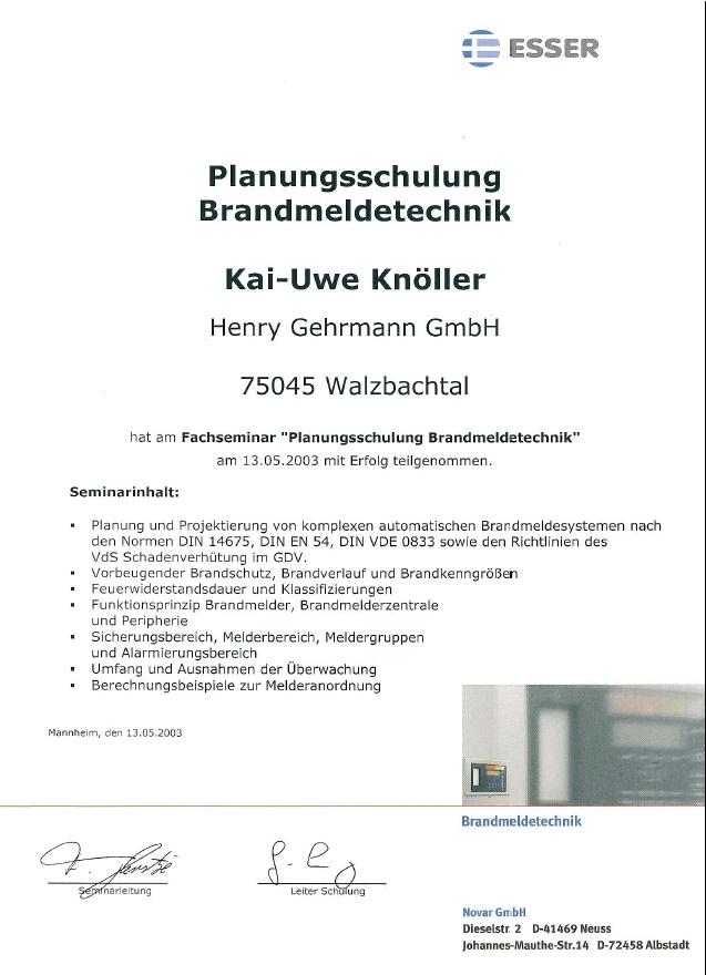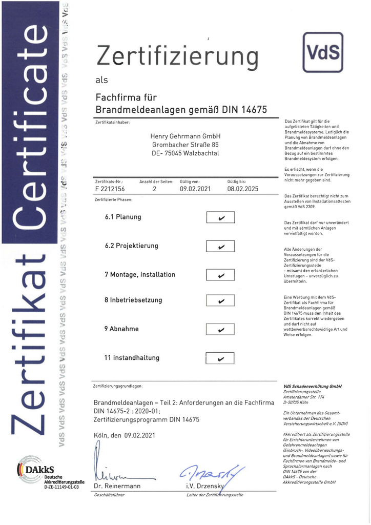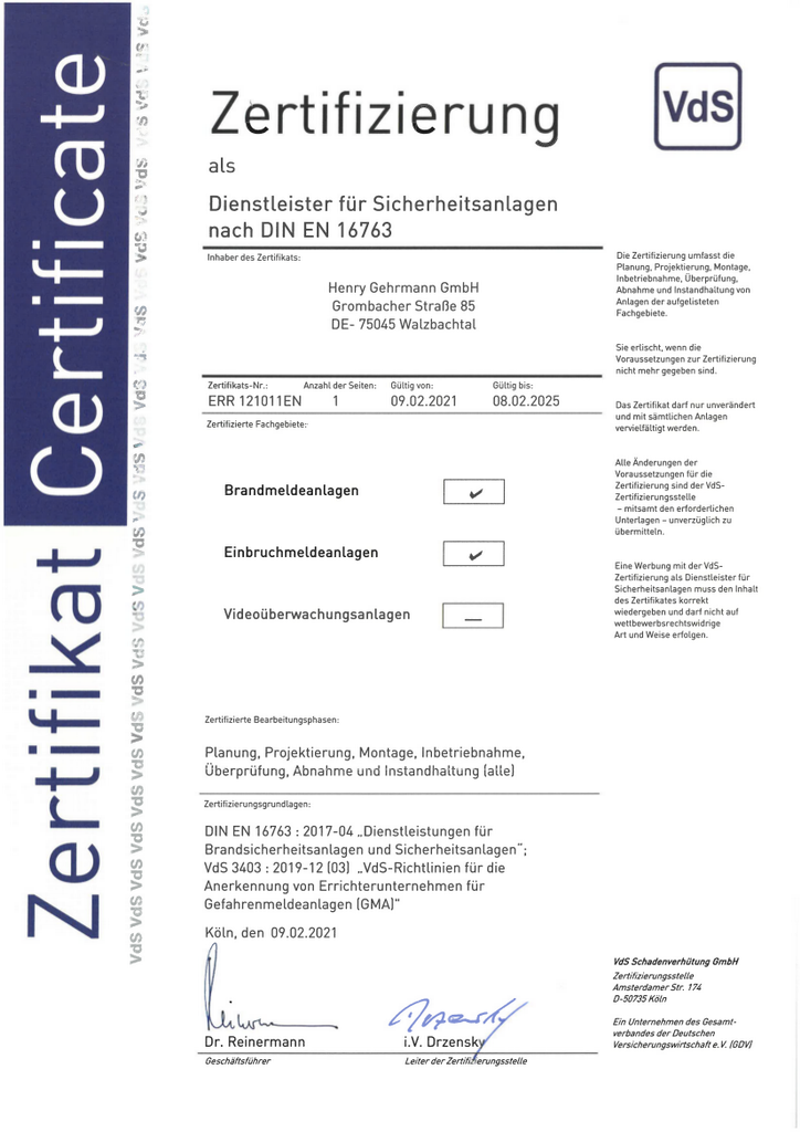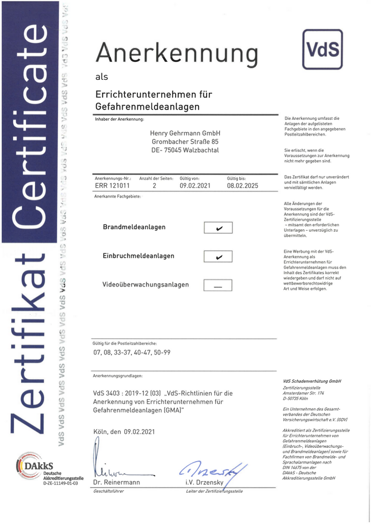 bescheinigt der Gehrmann GmbH die Anerkennung als Errichterfirma für Einbruchmeldetechnik, Brandmeldetechnik & Fachfirma für Brandmeldeanlagen nach DIN14675.