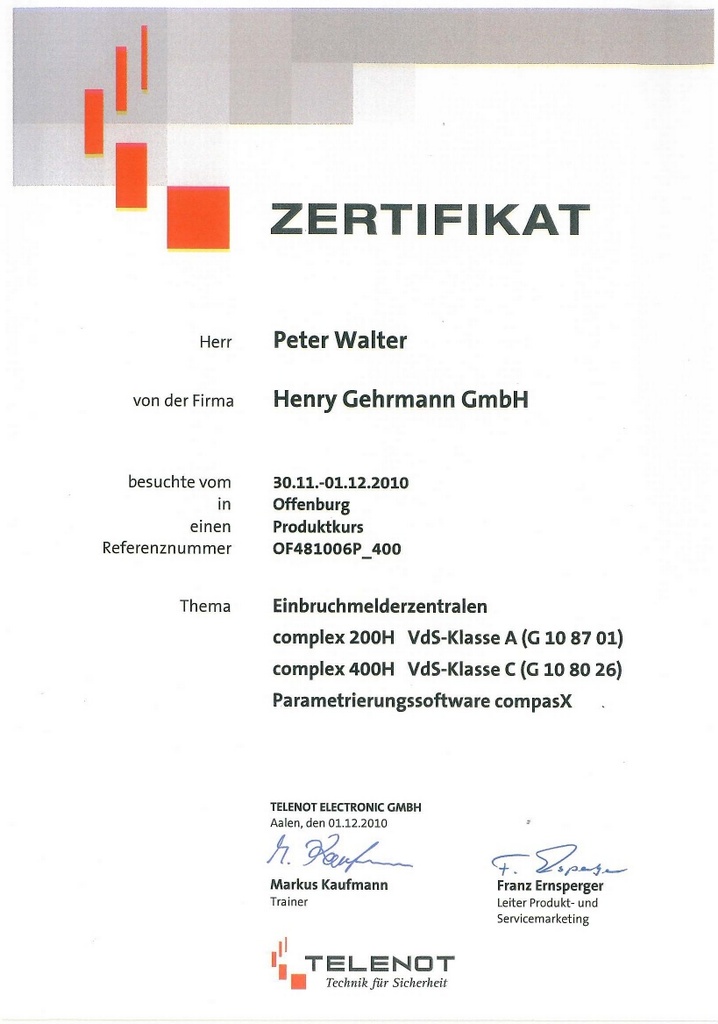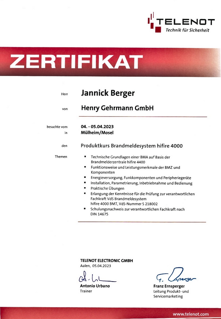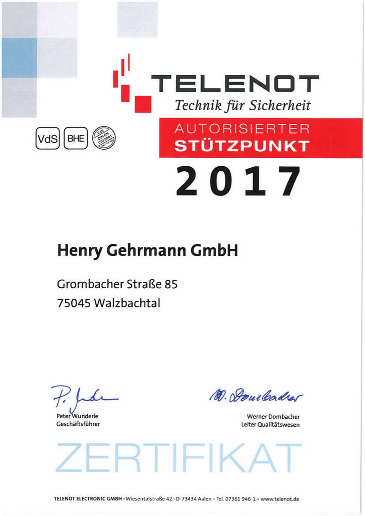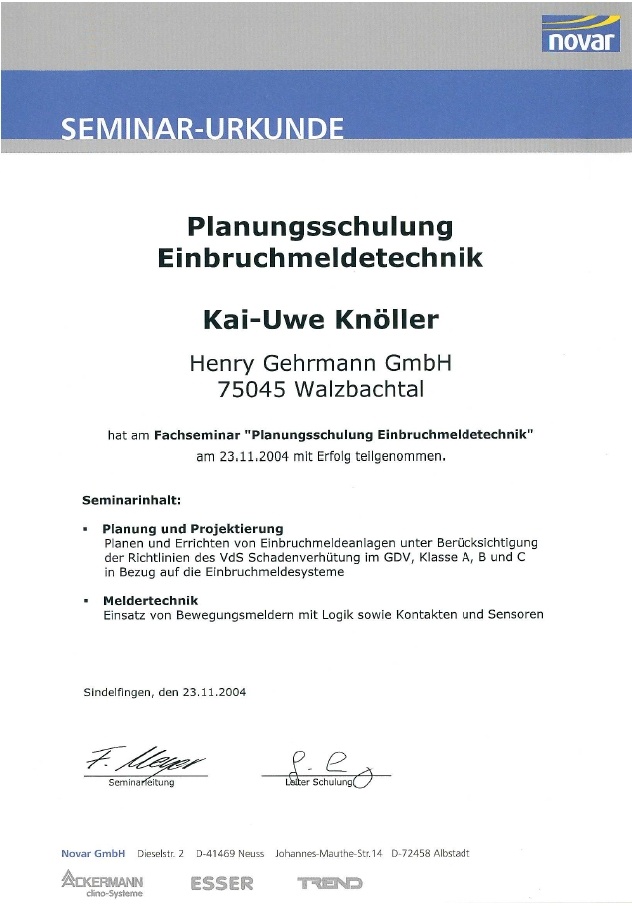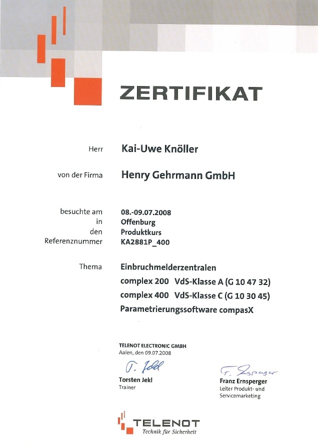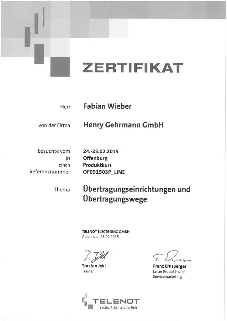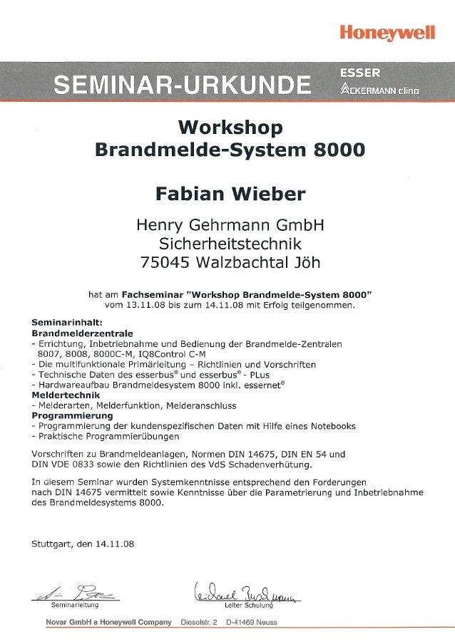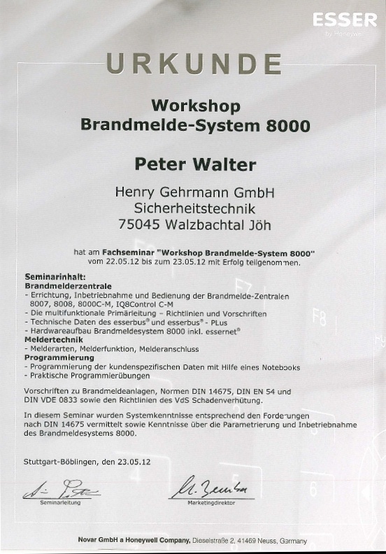 bescheinigt der Gehrmann GmbH die Anerkennung als Errichterfirma für Einbruchmeldetechnik, Brandmeldetechnik & Fachfirma für Brandmeldeanlagen nach DIN14675.
